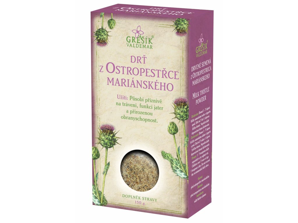 Doplněk stravy Drť z ostropestřce mariánského Působí příznivě na trávení, funkci jater a přirozenou obranyschopnost.Dávkování: Denně 1 - 3 čajové lžičky samostatně nebo v jogurtu apod. Děti od 3 let 1 čajovou lžičku denně.